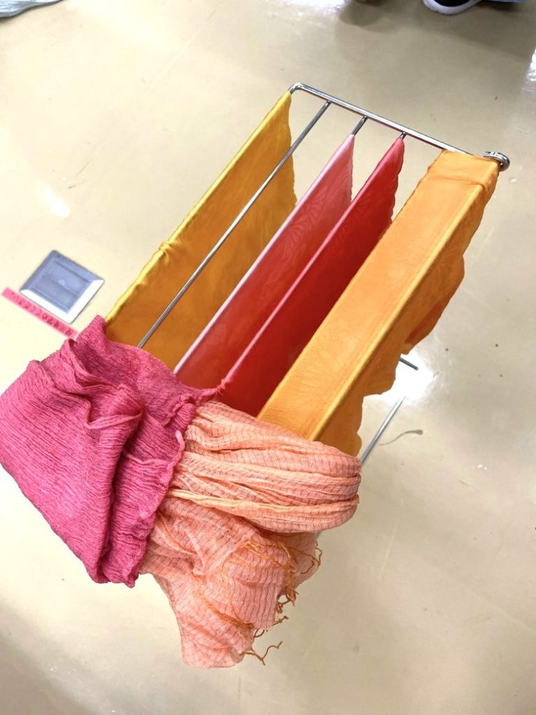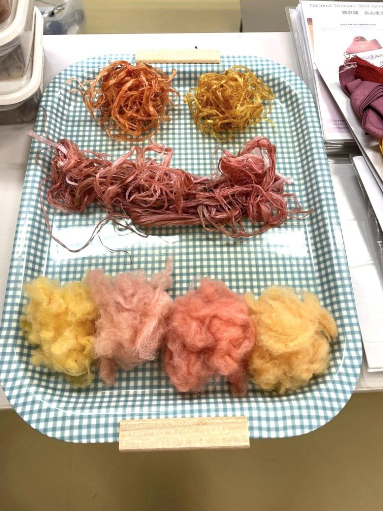 異なる繊維を様々な色に染めていただきました。日本茜のポテンシャルの高さが表れています。